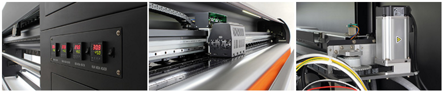 1· 機器左側清洗區增加照明燈,方便清洗噴頭。機罩下配LED燈帶,方便對打印質量的檢測。 2· 老款PE機型采用前后兩段加熱,新款PER額外增加了中段打印平臺加熱,介質受熱更平均更服帖,打印精度更高。 3· 增加后抬輪手柄,方便上布打印4· 吸附風扇功率加大,風力可調節,分 1.8 /2.5 /3.2三段控制。 5· 前后面板噴特氟龍處理,美觀大氣,前面板加厚,加熱不變形。打印臺面加寬,走布更平順。 6· 采用降噪同步帶,靜音導軌,小車運行平穩且靜音。 · 向傳動用軸承的直徑加大,能承受更高小車載荷。 7· 改進光柵安裝方式,增加光柵保護罩。 8· 選配項目:噴頭下底板加熱裝置。